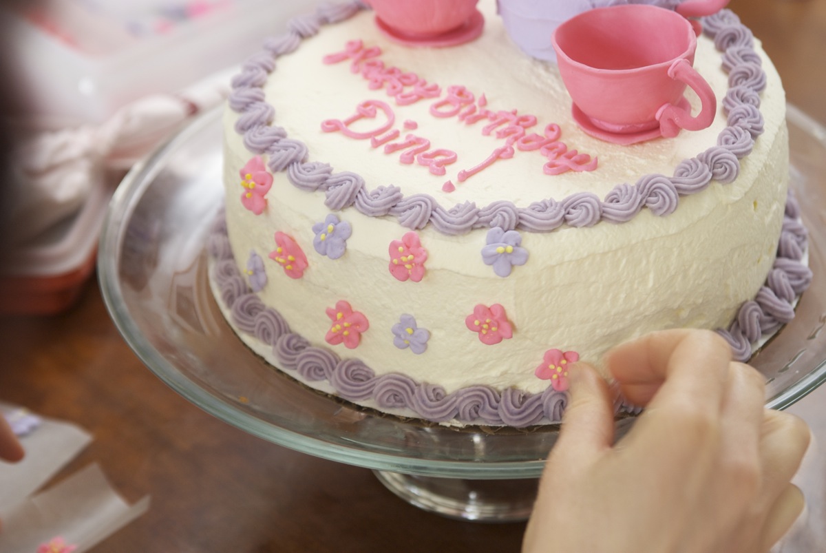 I placed the tea cups, flowers, butterflies at the last moment because I used a whipped cream frosting which, over time (like an hour or two) will begin to melt a bit, even if stabilized. A side note: Dutch whipped cream is the bomb, people.